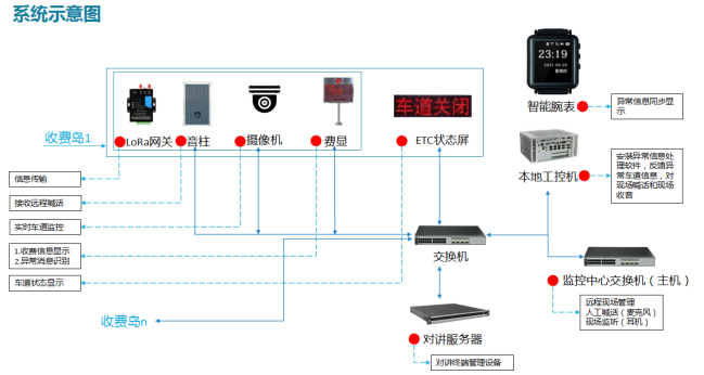 該系統(tǒng)由費額顯示系統(tǒng)、語音提示系統(tǒng)、無線通信系統(tǒng)、車道狀態(tài)屏、車道引流屏共同組成。當(dāng)收費車道出現(xiàn)異常,管理人員通過“智能腕表”同步接受異常提示,費額顯示器、車道狀態(tài)屏顯示異常信息,同步到收費站前的車道引流屏提醒車輛收費車道通行情況,防止車輛持續(xù)涌入導(dǎo)致?lián)矶隆?/p>